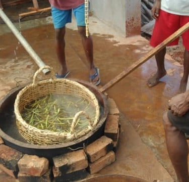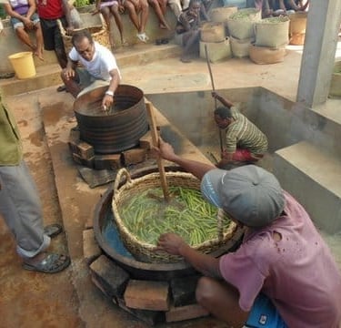 Après la récolte, les gousses de vanille passent par l’étape de l’échaudage, un processus clé pour stopper la maturation et amorcer le développement des arômes. Lors de l’échaudage, les gousses sont plongées dans de l’eau chaude à une température précise, permettant ainsi d’interrompre leur croissance tout en conservant leurs qualités intrinsèques. Ce bain rapide est essentiel pour initier la transformation chimique qui donnera à la vanille ses arômes uniques.